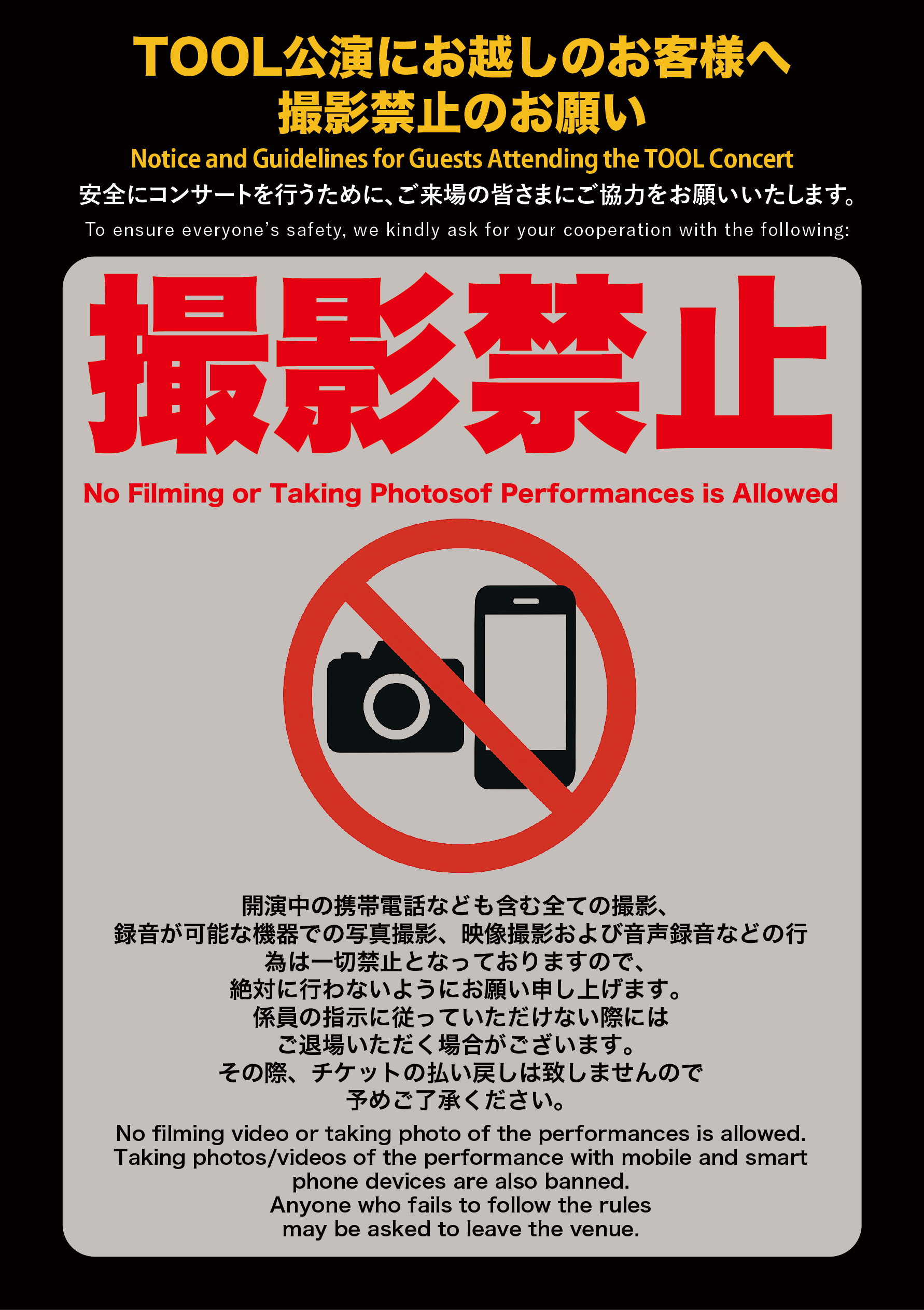 *Please be aware that bringing video cameras, professional cameras (with interchangeable lenses), telephoto lenses, sound recording equipment, action cameras, etc. and live streaming is prohibited.