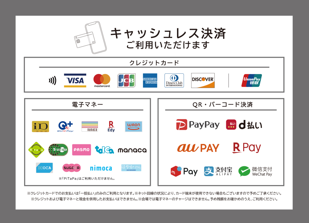 ※お支払いは現金とキャッシュレス決済のご利用が可能です。決済ブランドは当日ご確認下さい。