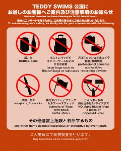 瓶、缶、ボストンバッグやキャリーケースなどの大きな荷物、プロフェッショナルカメラ、録音/録画機器、武器、花火、棒付きバナー/フラッグ / セルフィースティック、その他運営上危険と判断するものサインボードの持ち込みは可能ですが、サイズはA4までとさせていただきます。