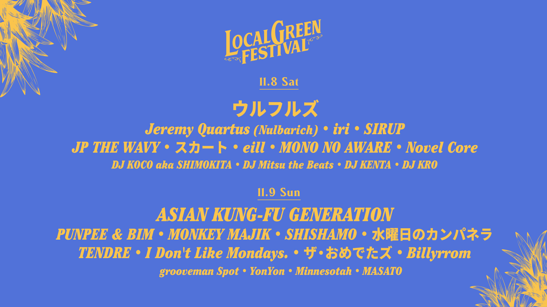 横浜赤レンガ倉庫を舞台に、「Life with Green」がコンセプトの、グリーンとグッドミュージックが楽しめるフェスティバル「LOCALGREEN FESTIVAL’25」が11月8日(土)、9日(日)に開催!ウルフルズ、ASIAN KUNG-FU GENERATION、 Jeremy Quartus (Nulbarich) 、 PUNPEE & BIM 、iri、MONKEY MAJIK等が出演!